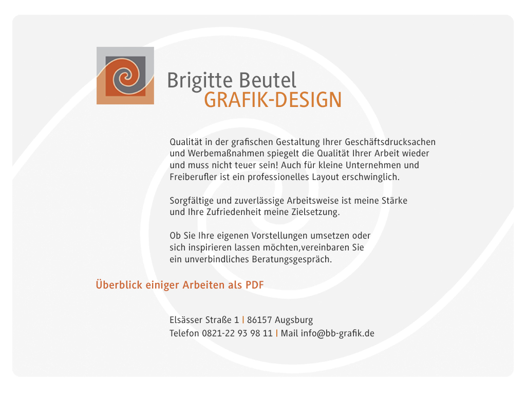 Brigitte Beutel | Grafik-Design | Augsburg | DTP | Layout | Entwurf | Drucksachen | Gestaltung | Satz | Flyer | Prospekte | Broschüren | Geschäftsausstattung